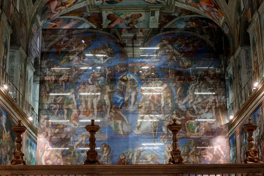 La Capilla Sixtina durante el mantenimiento extraordinario del Juicio Final de Miguel Ángel. EFE/EPA/GIUSEPPE LAMI