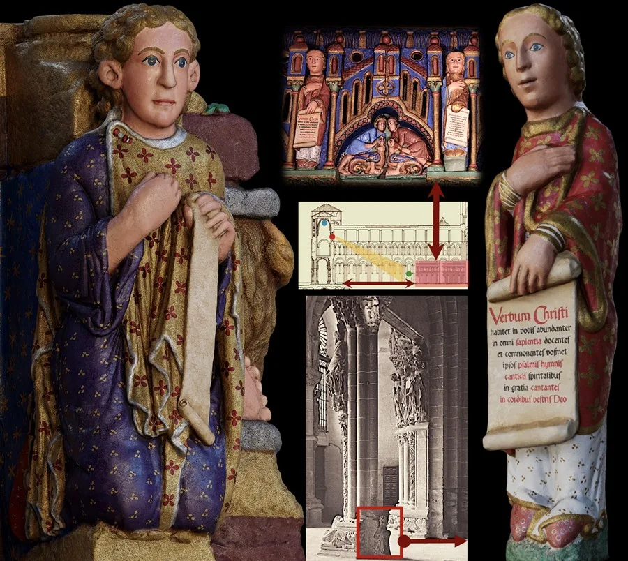Junto a las imágenes de la restauración de los colores, el equipo muestra «un estudio que ha permitido descodificar las claves de su diseño gestual y de su disposición escenográfica, poniéndola en relación tanto con la famosa inscripción de los dinteles, donde figura el nombre del maestro Mateo, como con el coro pétreo hacia el que dirige su mirada», indica la USC en un comunicado.